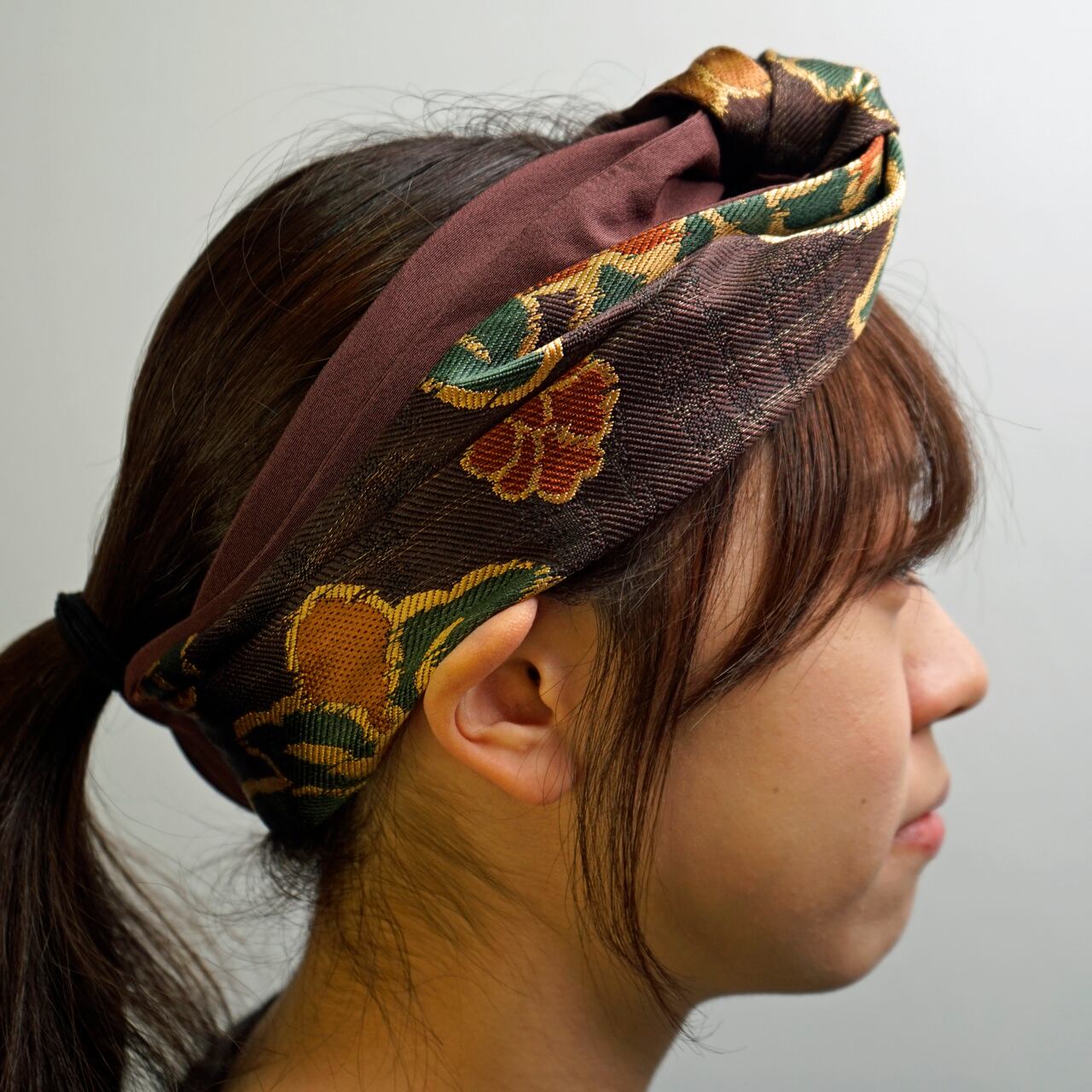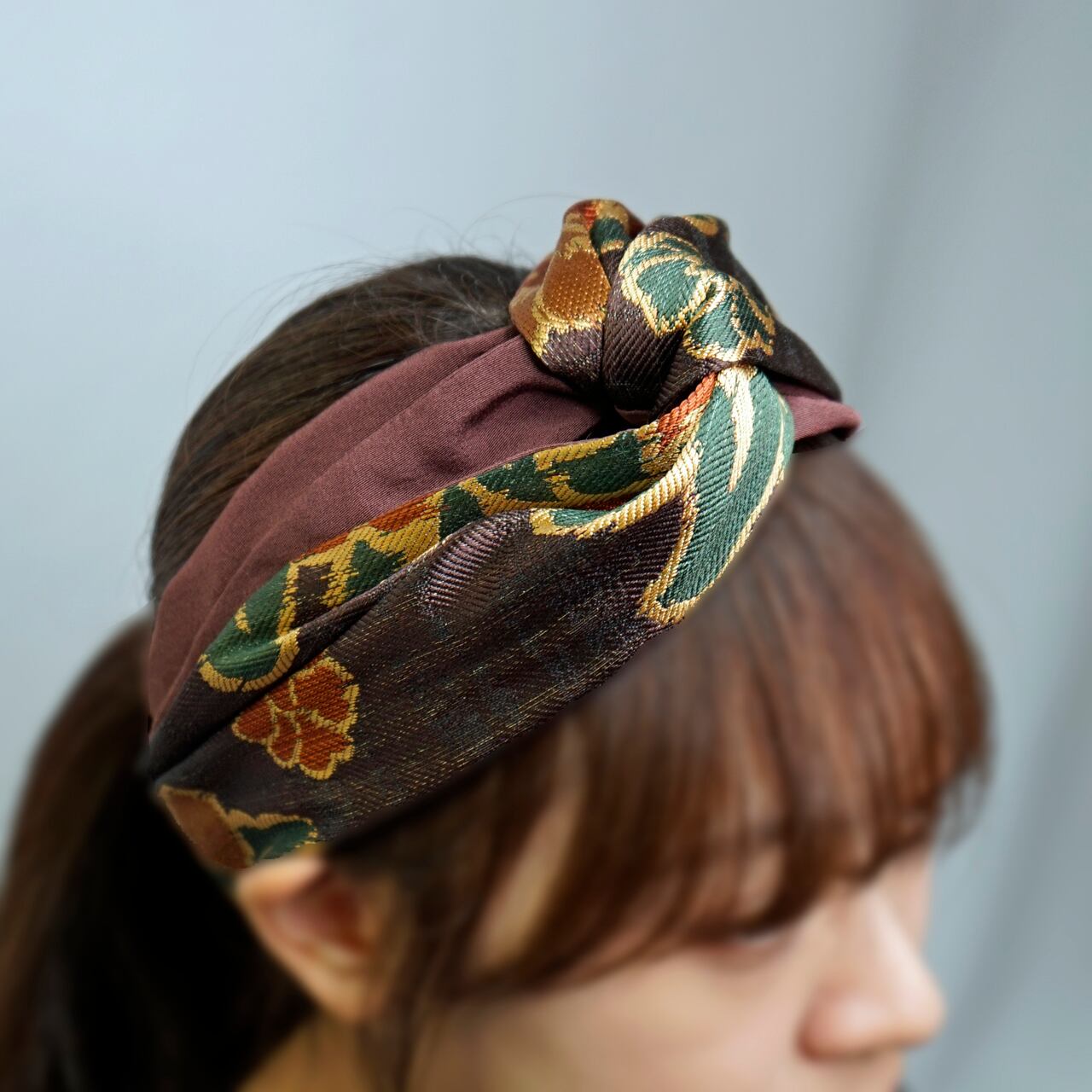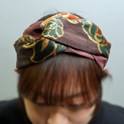 京都・西陣で約70年の歴史を持つ〈田村屋〉の帯地を、ファッションデザイナー・マサミ佐藤とのコラボレーションで新たな命へと昇華させた、アップサイクル・ターバンです。