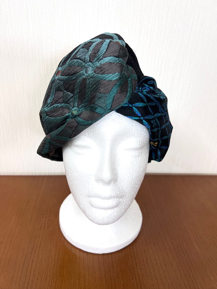 このターバンは、そんな未使用の帯地に新たな光を当てて仕立てた一品。
