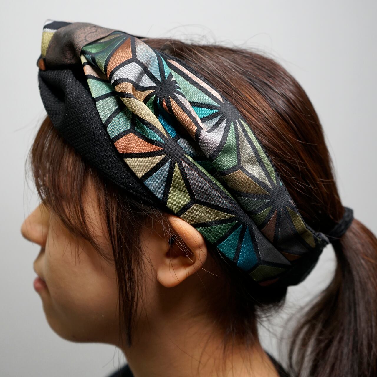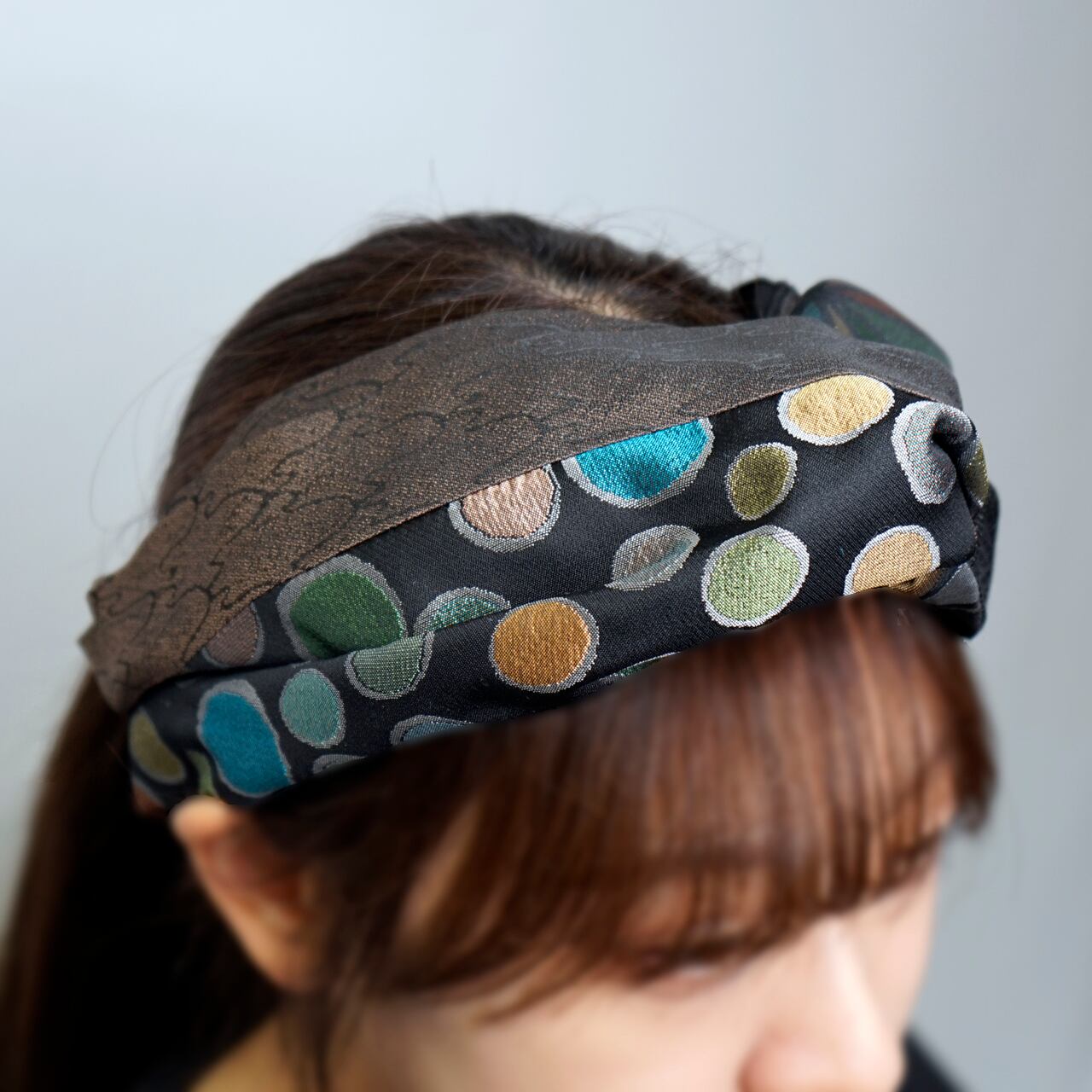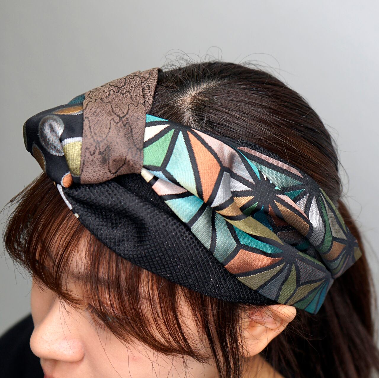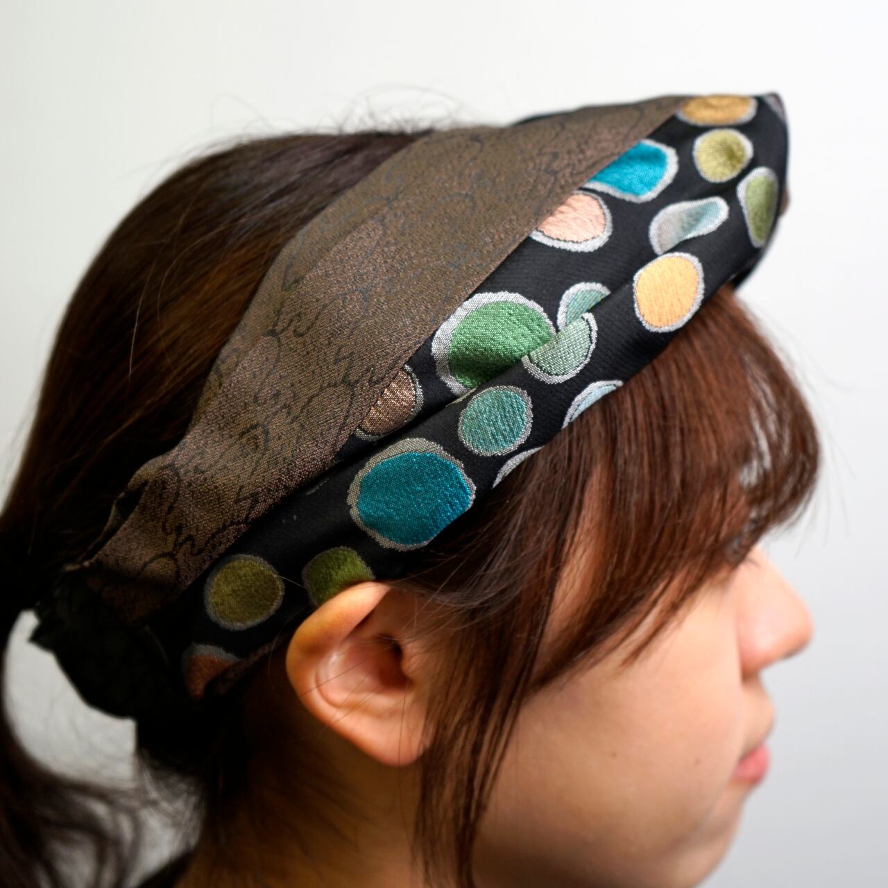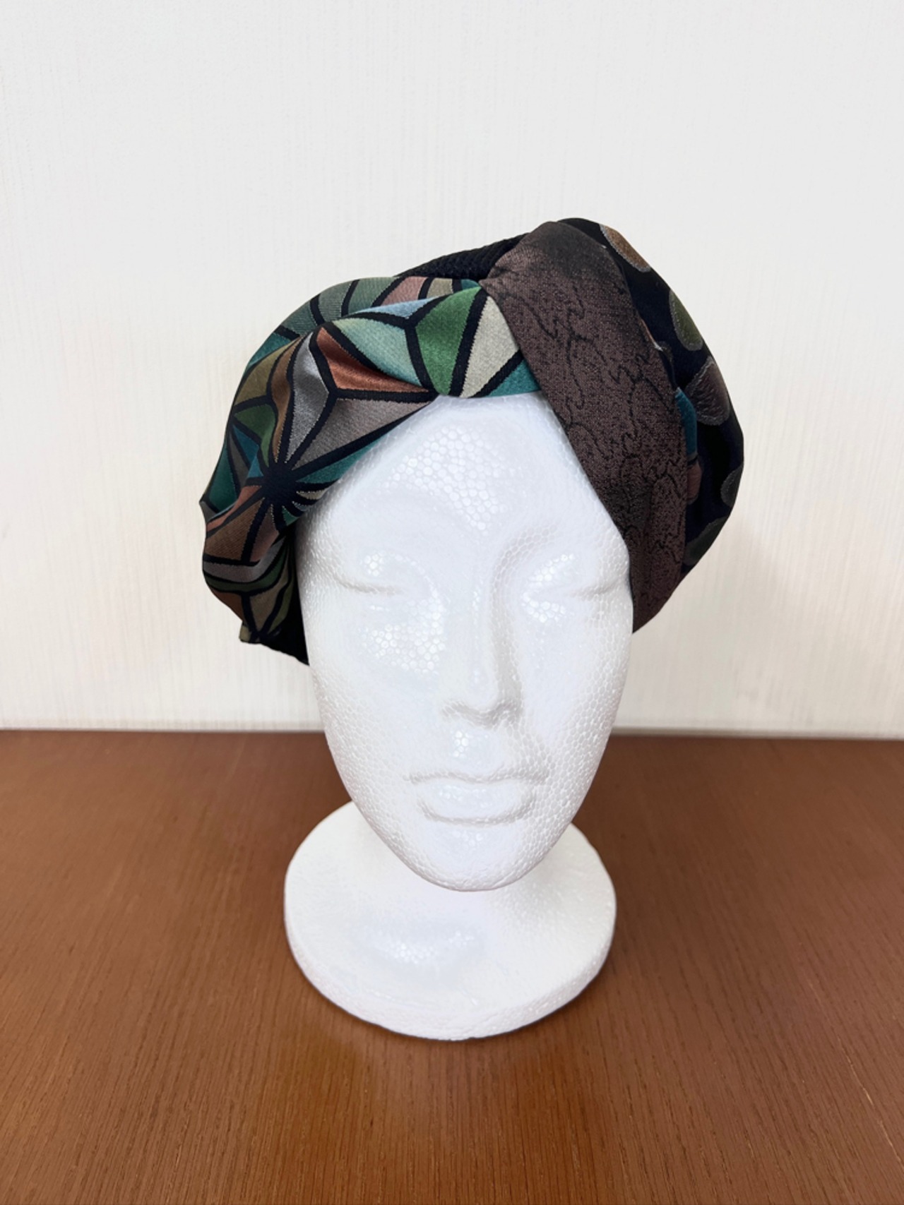 このターバンは、そんな未使用の帯地に新たな光を当てて仕立てた一品。