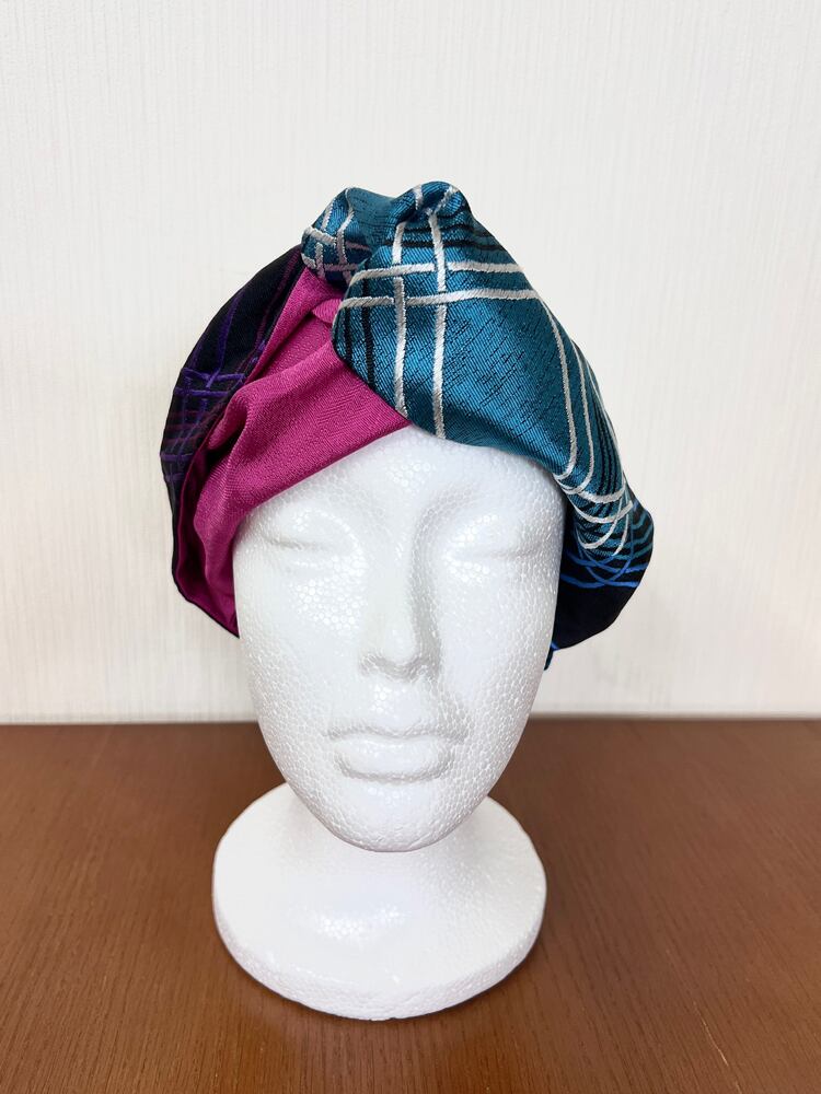 このターバンは、そんな未使用の帯地に新たな光を当てて仕立てた一品。