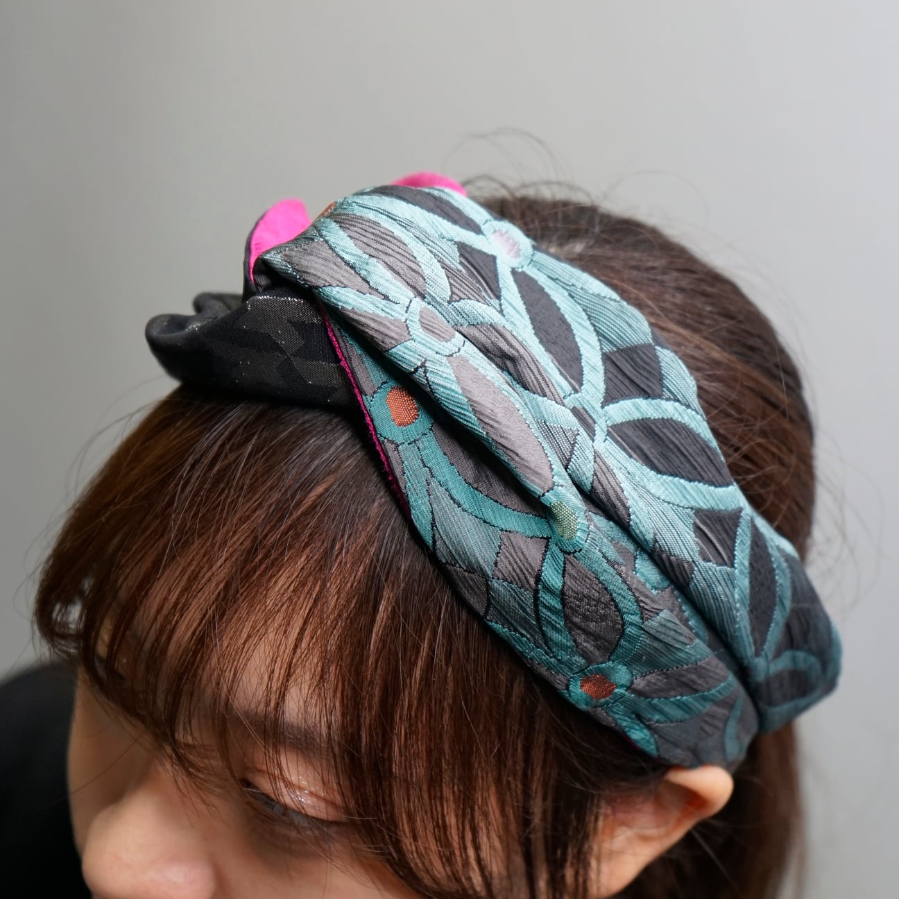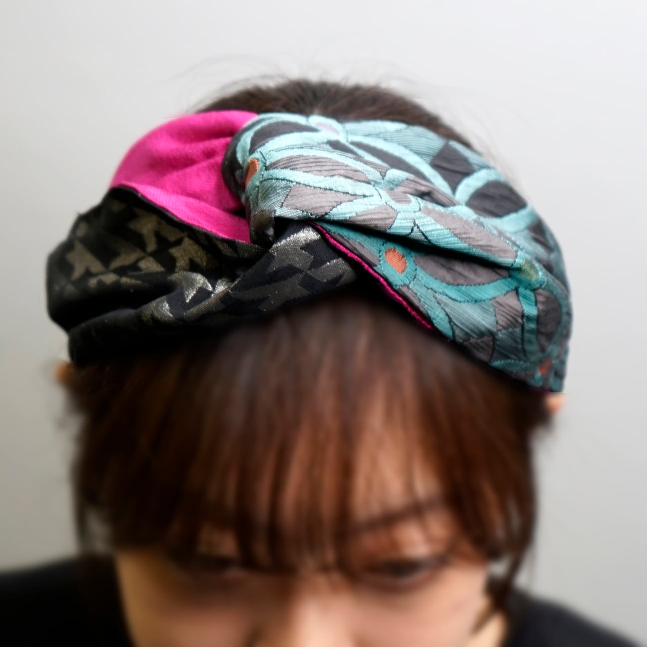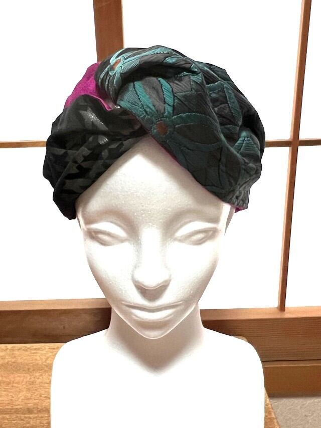 このターバンは、そんな未使用の帯地に新たな光を当てて仕立てた一品。