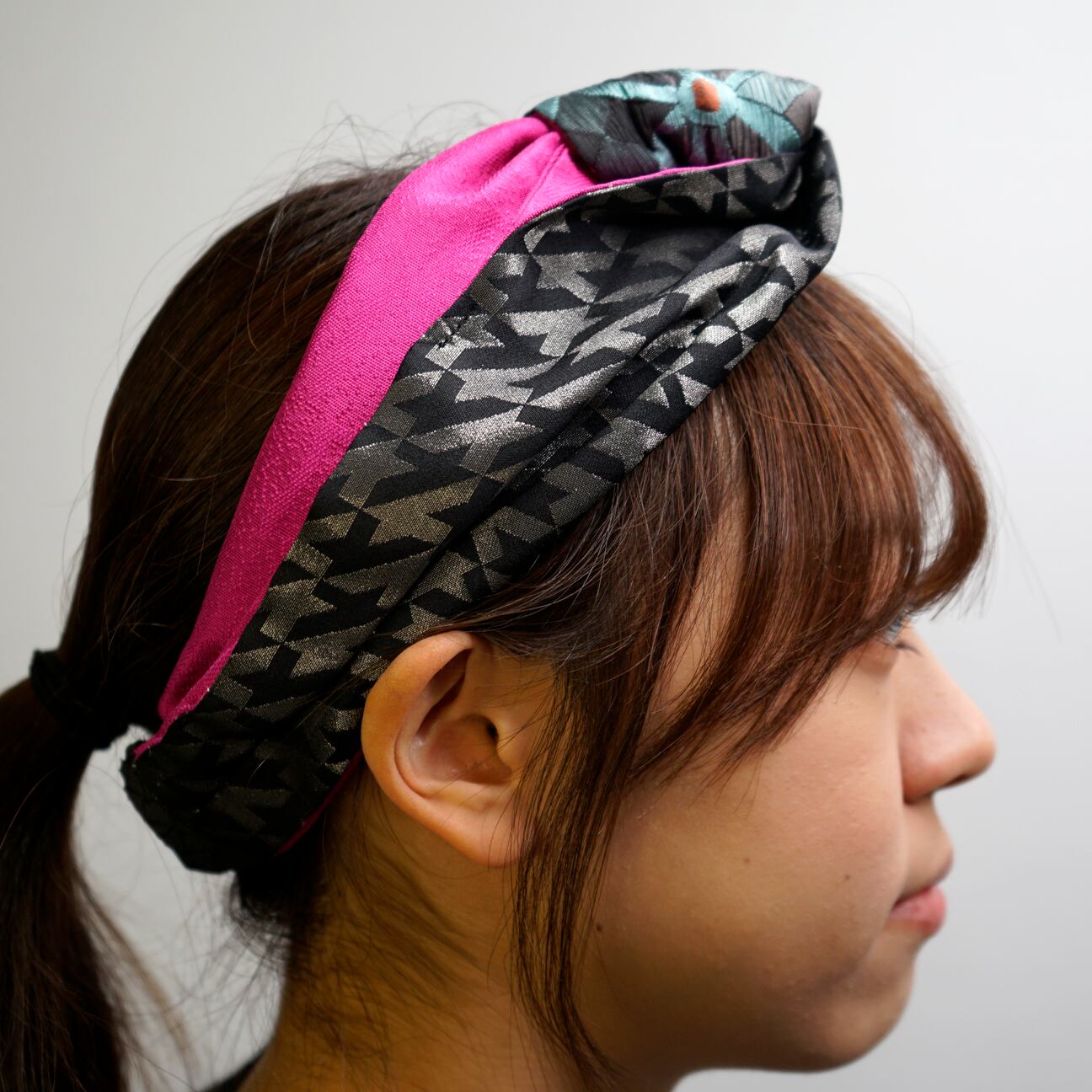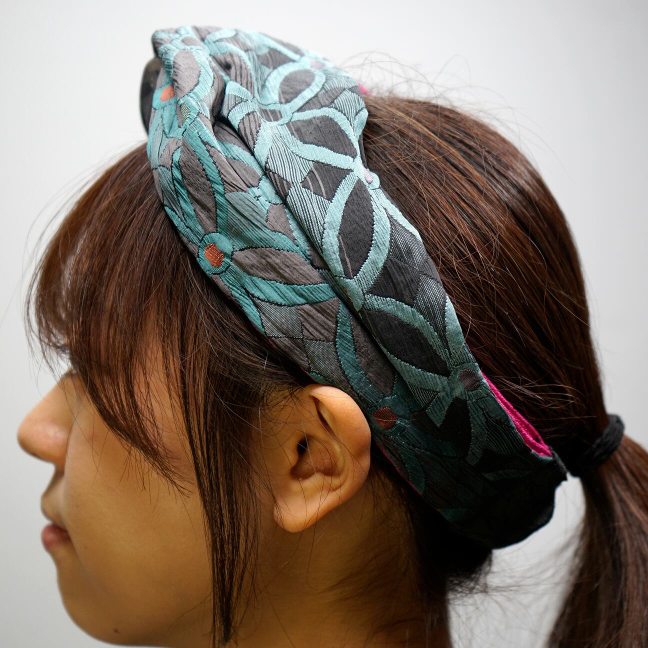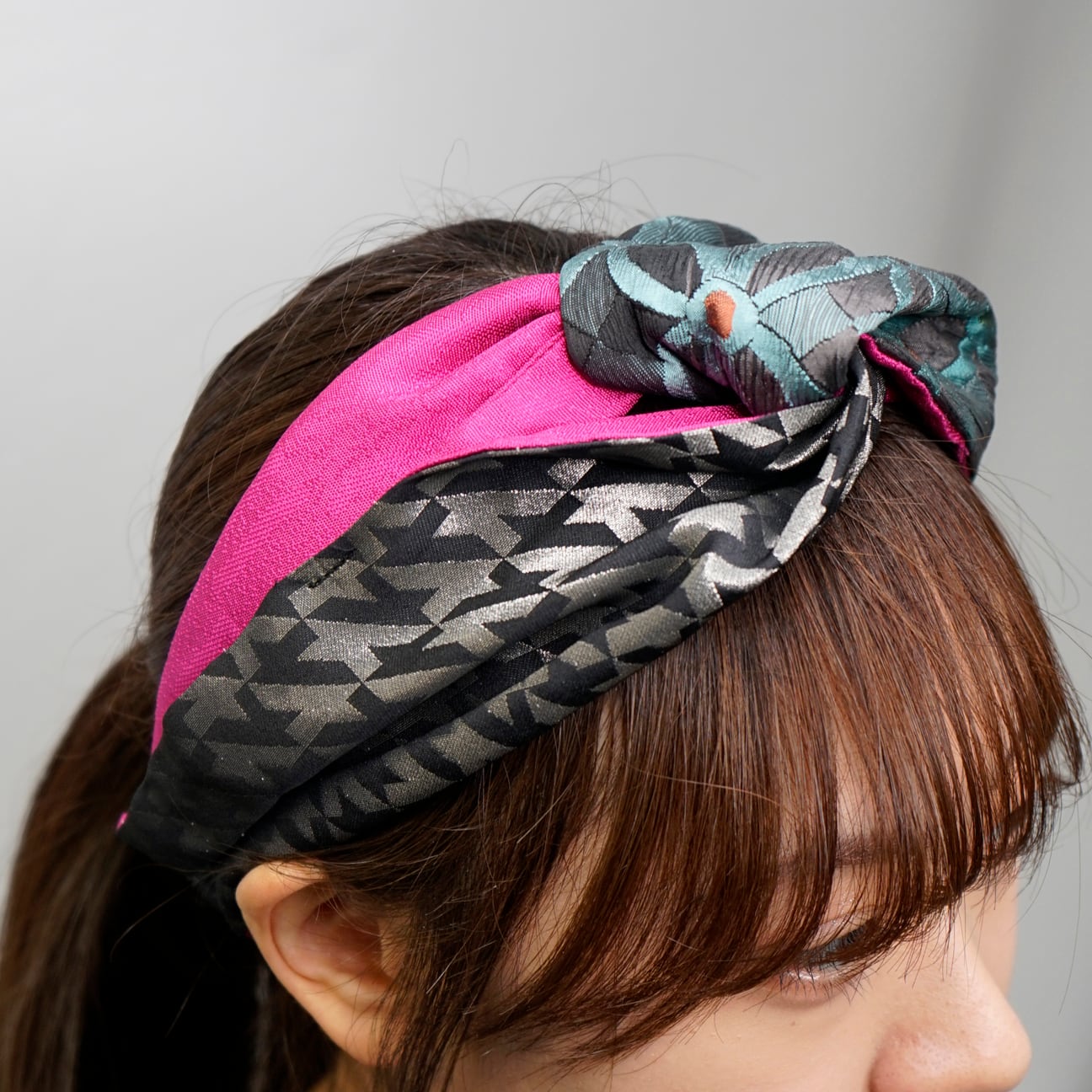 このターバンは、そんな未使用の帯地に新たな光を当てて仕立てた一品。