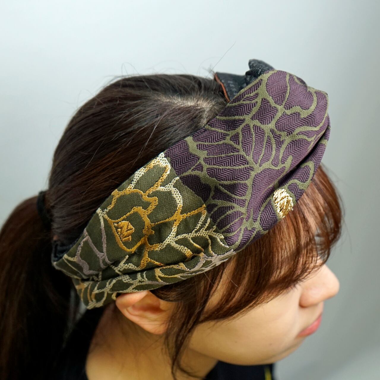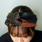 京都・西陣で約70年の歴史を持つ〈田村屋〉の帯地を、ファッションデザイナー・マサミ佐藤とのコラボレーションで新たな命へと昇華させた、アップサイクル・ターバンです。